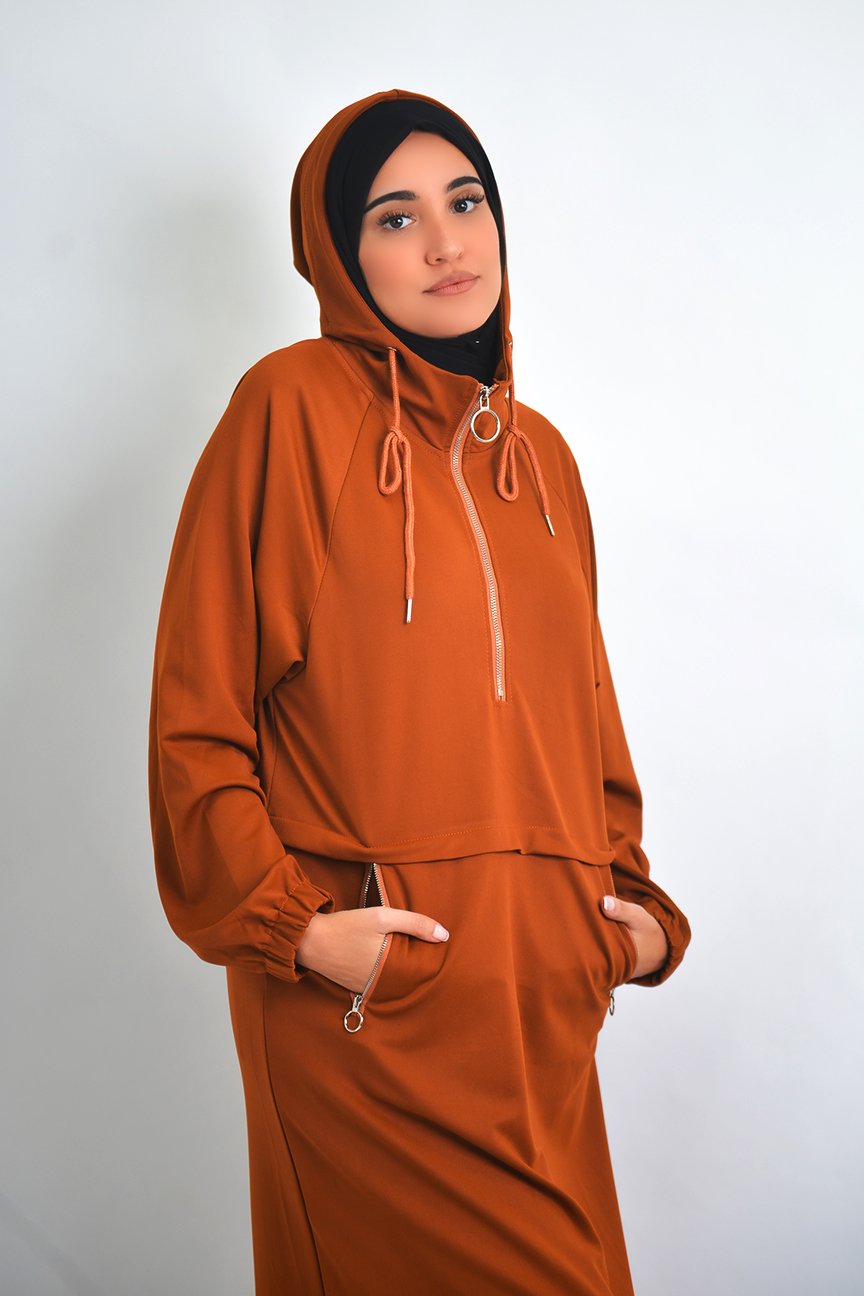 Deze Activewear abaya is een echte must-have! De rechte vorm, sportieve details en stof maken deze abaya perfect om te dragen in de sportschool of onderweg. Met genoeg zakken met sluiting is het makkelijk om je spullen mee te nemen terwijl je actief blijft. Geweldig voor op reis en comfortabel genoeg om ook dagelijks te dragen!